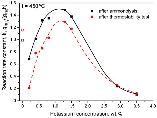 Catalytic activity of COMON catalysts as a function of the potassium concentration measured after ammonolysis and after the thermostability test. Catalytic tests were carried out at 450 °C under 10 MPa. Lines are given for eye guidance.
