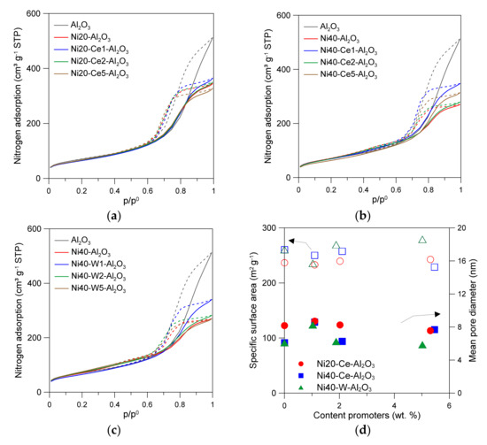 The γ-Al2O3 used as support showed high specific surface area (251.7 m2/g) (Table 1). An introduction of 20 wt % Ni led to the decrease in specific surface area to 236.7 m2/g. The course of nitrogen adsorption/desorption isotherms of the support and catalysts presented in Figure 1 was similar, and can be considered as IV-type, in agreement with the IUPAC recommendations [23]. The observed hysteresis loops, classified as H2(b), indicate the presence of mesopores. The decrease of mean pore diameter (DBJH) and total pore volume (Vp) can be assigned to partial blockage of small pores of alumina support by nickel oxide or nickel aluminate species.