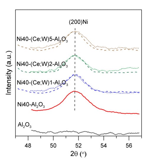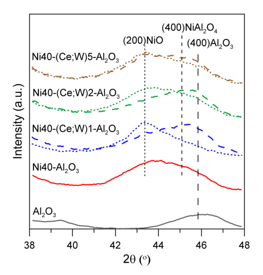 It is also difficult to unambiguously reject the possibility of the coexistence of dispersed nickel aluminate phases (NiAl2O4) due to similar position of reflection lines of such phases and width of X-ray diffraction peaks. Isolated XRD peaks of cerium and tungsten containing phases, such as CeO2, WO3, nickel aluminates, cerium aluminates, and aluminum or nickel tungstates, were not visible, indicating the presence of very small nanoparticles and their non-crystalline or amorphous nature. However, in comparing the narrow region of XRD curves for promoted Ni40-Al2O3 catalysts (Figure 2), we were able to distinguish weaker shift of overlapping NiO and Al2O3 peaks towards lower angles for W-promoted catalysts (dashed lines) in comparison to unpromoted and Ce-promoted nickel catalysts (solid and dotted lines, respectively). This effect can be attributed to the presence of smaller NiO particles in W-promoted catalysts or participation of Ni in the dispersed nickel tungstate phases.