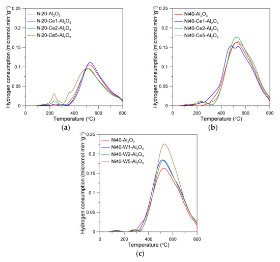 The temperature-programed reduction curves of alumina-supported nickel catalysts are presented in the Figure 3. The catalysts were reduced in a wide range of temperatures. One can observe small TPR peaks on the curve of Ni40-Al2O3 catalyst, located in the range from 250 to 350 °C. The predominant reduction peaks occurred between 350 and 800 °C, with large maximum at around 520 °C. The reduction of cerium-promoted catalysts depended on the content of Ni and Ce. The effects of the presence of cerium were more visible in the catalysts with low nickel loading and may have directly resulted from differences in the Ce/Ni ratio in the catalysts. The introduction of the small amounts of Ce to the catalysts with 20 wt % Ni led to the increase in reducibility. This effect was especially manifested in the increase in the intensity of low-temperature peaks and small shift of high-temperature reduction peaks to the lower temperatures. Similar effects were visible for the catalysts with high nickel loading, but the extent was much weaker. Low-temperature peaks were not visible in the W-promoted catalysts. The increase in the main peak intensity with an increase in W content was observed. In the literature, low-temperature reduction peaks on the TPR curves of nickel catalysts have been often attributed to the consumption of hydrogen in the reduction of “free NiO” crystallites, weakly interacting with alumina support, accordingly to the reaction NiO + H2 → Ni + H2O [41,42]. On the other hand, high-temperature peaks were attributed to the reduction of nickel oxide phases strongly interacting with alumina. High reduction temperature may also lead to the formation of oxygen vacancies and partial reduction of cerium (Ce4+ → Ce3+) in CeO2 species [43].