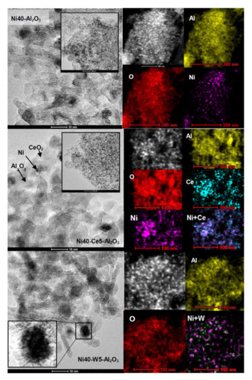 Transmission electron microscopy images of selected catalysts after reduction at 600 °C are presented in Figure 5. Ni40-Al2O3 catalyst contained round nickel crystallites deposited on highly dispersed alumina particles. More detailed inspection of catalysts’ morphology revealed the presence of some surface roughness and irregularities in the shape of nickel crystallites. Some crystallites appeared to be partially covered by the support. The catalyst promoted with cerium and tungsten (Ni40-Ce5-Al2O3 and Ni40-W5-Al2O3, respectively) showed similar morphology (Figure 5). The inset in Figure 5 reveals the presence of nickel particle in the Ni40-W5-Al2O3 catalyst partially covered by amorphous–like phases; however, it is difficult to state their chemical nature. STEM images confirmed strong mutual mixing of Ni, Al, Ce, and W elements in the catalysts.