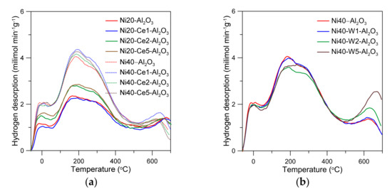 The curves of hydrogen temperature-programmed desorption are presented in Figure 7. In the case of Ni20-Al2O3 catalyst, the overlapped peaks were observed between −50 and 700 °C. The peaks below 500 °C can be in general ascribed to the desorption of hydrogen from the sites of different strengths on the surface of nickel crystallites [47,48]. High-temperature peaks, above 500 °C, in the literature have been often ascribed to the re-oxidation of nickel by the contribution of hydroxyl groups from the support [49]. The intensity of low temperature peak (−50–100 °C) and wide multiple peaks located between 100 and 500 °C increased with an increase in Ce content for Ni20-Ce-Al2O3 catalysts. Such effects indicate an increase in the number of active nickel surface sites, resulting from the decrease in nickel particle size. The intensity of desorption peaks increased with an increase in Ni loading (Ni40-Ce-Al2O3).