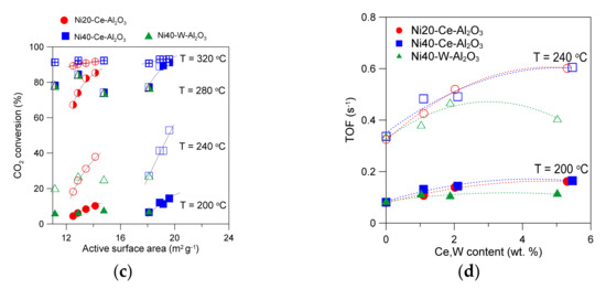 CO2 conversion and selectivity to methane for alumina-supported catalysts promoted with Ce, containing 20 wt % Ni (a). Influence of catalyst composition on CO2 conversion at selected temperatures (b). The effects of active surface area on CO2 conversion (c). The influence of Ce or W content in catalysts on TOF values at selected temperatures (d).