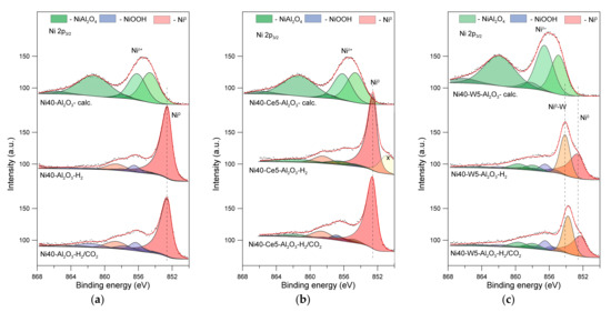 The spectra of reduced alumina-supported catalyst (denoted here as Ni40-Al2O3–H2) showed distinct Ni 2p3/2 peak located at 852.5 eV with corresponding smaller satellite peaks at 856.2 and 858.6 eV, which can be attributed to the presence of metallic nickel (Ni0) [64,65]. In addition, it was possible to distinguish several peaks located at higher energies, ascribed to Niδ+, the nature of which is difficult to determine unambiguously (Figure 9). The best fit was obtained through assuming the presence of NiOOH-like phases. The formation of such species could result from the reoxidation of surface nickel atoms lying in the immediate vicinity of the alumina support (or alumina species decorated the surface of crystallites) by the participation of hydroxyl groups from Al2O3. Similar phases were identified by the analysis of the XPS spectrum of Ni40-Ce5-Al2O3-H2 catalyst sample. A good fit was achieved by additional assumption of the presence of small amounts of NiAl2O4 (Table S1). Slightly smaller contribution of NiOOH phases could be a consequence of the presence of dispersed CeO2 particles lying in the direct vicinity of surface nickel atoms (Table S1).
