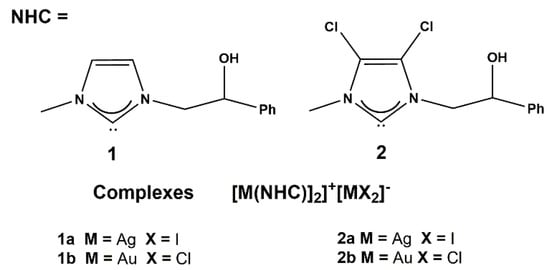 It is worth noting that some of us, in previous work, have already carried out a study of the catalytic [] and biological [,,] behavior of similar silver and gold complexes bearing NHC ligands (see Figure 1), obtaining very interesting results.