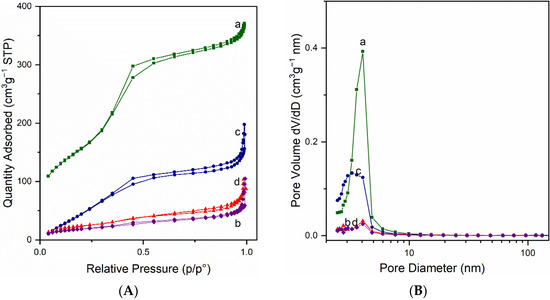 (A) N2 adsorption and desorption isotherms, and (B) pore size distributions (PSD) of: (a) SiO2, (b) NH2SiO2, (c) Pd-P /NH2-SiO2, (d) Pd°/NH2-SiO2.