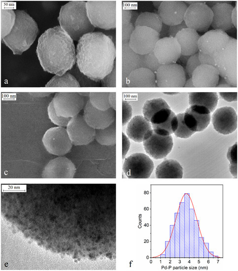 Further imaging of Pd-P/NH2-SiO2 was carried out by TEM to explore the presence of isolated aggregates of phosphorous species in addition to Pd-P alloy, and to confirm the particle size and the homogeneous distribution of palladium (Figure 2d,e).