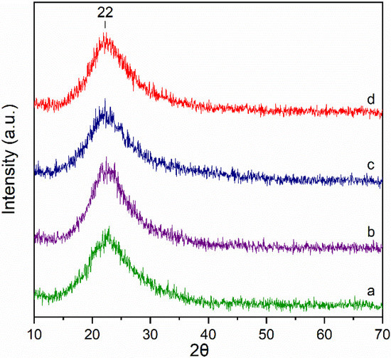 X-ray diffraction (XRD) patterns of samples: (a) SiO2, (b) NH2-SiO2, (c) Pd-P/NH2-SiO2, (d) Pd°/NH2-SiO2.