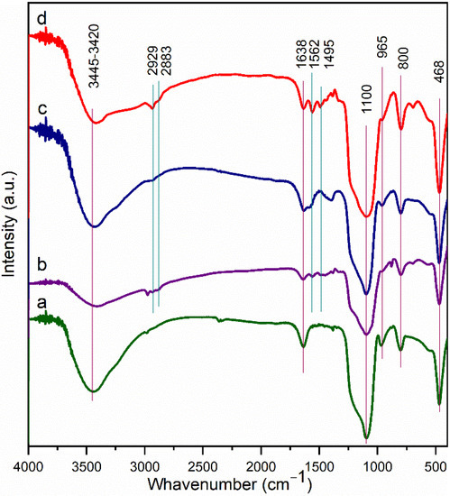 The effectiveness of silica functionalization was investigated by FTIR spectroscopy. Figure 4 shows FTIR spectra of the support, pure and functionalized, and of the Pd containing catalysts. The spectrum of pure silica support (spectrum a) showed: a broad peak at 3445 cm−1 and a peak at 1638 cm−1 assigned to the O-H stretching of silanol groups and to the bending of physically adsorbed water, respectively; a strong peak at about 1100 cm−1, peaks at 800 cm−1 and 468 cm−1, assigned to the asymmetric and symmetric stretching, and to bending vibrations of the framework (Si-O-Si), respectively; a peak at 965 cm−1 attributed to the asymmetric stretching of silanol bond Si-OH.