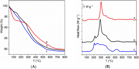 (A) Thermogravimetric (TG) analysis, as sample weight (%) versus temperature, (B) differential thermal analysis (DTA) as heat flow (W g−1) versus temperature patterns of samples: (a) NH2-SiO2, (b) Pd°/NH2-SiO2, (c) Pd-P/NH2-SiO2.