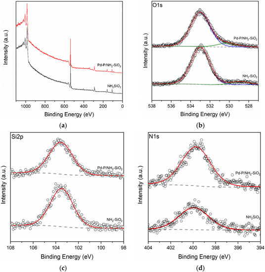 The NH2-SiO2 and Pd-P/NH2-SiO2 samples show the oxygen main peak O 1s, assigned to the oxygen bond of Si-O-Si in the bulk of silica, at 532.96 eV and 532.99 eV, respectively (Figure 6b). The secondary peaks of O 1s, at 528.88 eV and 530.15 eV, are due to oxygen bonded to carbon, or phosphorous and/or palladium. For both samples, the Si 2p, related to the silicon of the SiO2, was fitted by a single peak (Figure 6c) at 103.49 eV and 103.57 eV, respectively [38]. The C 1s peaks highlight the presence of residual organic compounds, probably due to the 3-APTES on both samples. For this reason, O 1s was taken as a reference for the correction of the binding energies instead of C 1s, which is generally used as reference in XPS analysis.