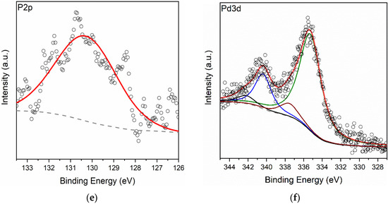 The Pd 3d spectrum (Figure 6f) shows two asymmetric peaks originated by the partial overlapping of peaks of Pd° at 335.28 and 340.37 eV with the less intense peaks of some electron-depleted palladium(II) at 337.55 and 342.22 eV, corresponding to Pd 3d5/2 and Pd 3d3/2, respectively. These values are in good agreement with the expected values for the Pd° and Pd(II) reported in literature [10,44]. The total amount of Pd(II) was estimated from the deconvoluted areas to be 13% of the total palladium content, suggesting that the catalyst was partially oxidize on the surface possibly due to the exposure to air before XPS analysis.