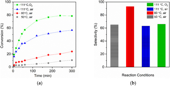 Toluene was chosen to check the effect of temperature and oxygen concentration on the catalytic activity and selectivity of Pd-P/NH2-SiO2 because the best activity was obtained in this solvent and, it could provide the opportunity of performing the reaction at higher temperatures, The reaction conditions and outcomes are reported in Table 6, and Figure 7. BnOH conversion after 5 h raised from 11% at 50 °C to 24% at 80 °C, and remarkably up to 57% at 111 °C. This is in line with the general trend of catalytic BnOH oxidation [18], and has been observed in other studies [9,54].