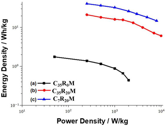 Ragone plot of (a) C35R0M (b) C35R20M and (c) C7R20M electrodes.