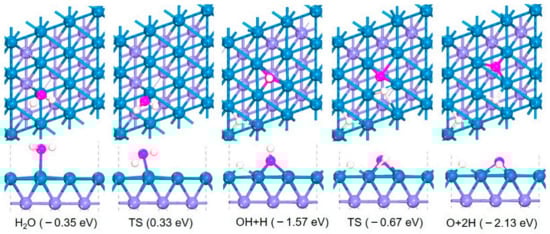 Firstly, the processes of H2O adsorption and dissociation on Fe (110) were studied. The most stable adsorption structures and energy change during the adsorption and dissociation processes are shown in Figure 1. The most stable adsorption configuration of H2O is one in which the O atom is adsorbed on top of the surface Fe atom, and the two H atoms are horizontally parallel to the surface with an adsorption energy of −0.35 eV. Among them, the H atom on one side keeps approaching the surface Fe near it, and then dissociates into *OH and *O, which need to overcome the energy barrier of 0.67 eV and unleash 1.22 eV heat. The process of the adsorbed *OH further dissociating into the O atom and H atom requires overcoming an energy barrier of 0.90 eV and releasing heat of 0.56 eV. The energy barriers in the two-step dissociation process of H2O on Fe (110) are 0.67 eV and 0.90 eV. Therefore, H2O is prone to complete dissociation on Fe (110) and the products are *O and two *H.