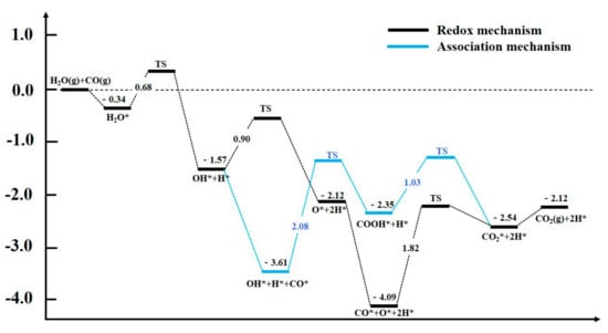 Similarly, the reaction process of the dissociated OH* and *O reacting with CO to produce CO2 was systematically studied and analyzed. Two reaction mechanisms, the redox mechanism and combined mechanism, were investigated and the results are shown in Figure 2. For the redox mechanism, the reaction process of *O and *CO co-adsorbed on Fe (110) reacting to form *CO2 only needs to overcome a barrier of 1.82 eV and absorb the heat of 1.55 eV, indicating that it is difficult for the redox mechanism to occur. For the association mechanism, *CO interacting with *OH adsorbed on adjacent Fe sites overcomes an energy barrier of 2.08 eV to generate *COOH and absorbs heat of 1.26 eV, indicating that it is also difficult for the formation of *COOH on Fe (110) to happen. However, if *COOH is generated, the energy barrier for dehydrogenation to generate *CO2 is 1.03 eV and the reaction releases heat of 0.13 eV. Therefore, the effective energy barrier for the combined mechanism is 2.29 eV and the total reaction process absorbs heat of 1.13 eV, which is almost impossible to occur.