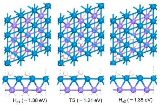 The migration processes and energy change of adsorbed H on Fe (110) are shown in Figure 4. When the coverage of *H is not quite high, H is absorbed on the three coordination holes of surface Fe sites. *H migrates from one Fe hole site (Ha1) to another Fe hole site adjacent to it (Feb) with an energy barrier of 0.17 eV and reaction heat of 0.0 eV. Therefore, the migration of H on Fe (110) is very easy, and the free migration of H on the Fe surface can easily occur.