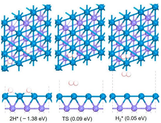 After calculating the migration capacity of H, the generation capacity of H2 on Fe (110) was also studied. Here, the most favorable H2 generation path on Fe (110), that is, the reaction process of H2 generation from two adjacent H atoms adsorbed on the surface, was calculated as shown in Figure 5. The H atom adsorbed from one Fe hole site migrates and attacks another *H adjacent to itself to generate adsorbed H2, which needs to overcome an energy barrier of 1.47 eV, and the reaction is endothermic with 1.43 eV. Therefore, when H and H2 interact with Fe (110), it is more favorable to H2 dissociation both thermally and dynamically. However, when the concentration of H on the surface is relatively high, it is also occurs for H2 generation.