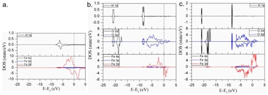 By comparing the H2 generation capacity of Fe (110) with that of Fe3O4 (111)-Fetet1 and Fe3O4 (001)-B, it can be found that the energy barrier for H2 generation of H adsorbed on O atoms on the Fe3O4 surface is very high, while the energy barrier of H adsorbed on Fe is low. Therefore, we want to know whether the strength of the interaction between the H atom and different surface sites could lead to the difference in H2 generation ability. Therefore, the local electron densities of state (LDOSs) of adsorbed *H interacting with the adsorption sites of Fe (110) were calculated, and the results are shown in Figure 6a. Similarly, the LDOS results of H interacting with Fe3O4 surfaces are compared and analyzed in Figure 6b,c. It can be seen from the figure that when H is adsorbed with the O site of Fe3O4 (001)-B or (111)-Fetet1, the energy level of the H 1s orbital is close to that of the O 2s and 2p orbitals; thus, the energy of their bonding orbital interaction is very low, and H bonding to O has a strong covalent bonding component. When H is adsorbed with Fe sites of Fe (110), the energy matching between the H 1s and Fe 3d orbitals is poor. The electron interaction between H and Fe belongs to weak metal bond interaction and there is almost no strong covalent bond interaction, so it can be seen that the interaction between H and Fe is weak. Thus, the electron interaction between H and Fe belongs to weak metal bond interaction and there is almost no strong covalent bond interaction.