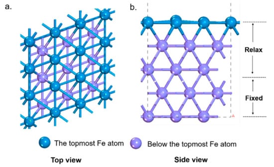 Fe (110) is the most stable surface of metal Fe and also the most easily exposed surface, so it was selected as the research object. The slab models are shown in Figure 7. In order to eliminate the reactants or product repulsion due to the close distribution between molecules, P (3 × 3) supercell expansion for Fe (110) was used. The slab keeps the top three atomic layers relaxed and the remaining two atomic layers fixed to represent the bulk phase in all the calculations.
