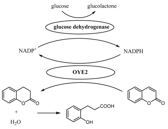 The ERs present in yeasts are FMN-containing Old Yellow Enzyme (OYE) oxidoreductases (EC 1.6.99.1). Since OYE2 is the most representative ER present in baker’s yeast [29], we decided to employ OYE2 from Saccharomyces cerevisiae as the enzyme of choice to perform coumarin reduction. Of course, due to high cost of the cofactor, preparative processes cannot make use of NAD(P)H in stoichiometric amount. Therefore, the use of a catalytic amount of the cofactor combined with a suitable regeneration system becomes mandatory. In this context, the oxidation of glucose to δ-gluconolactone catalysed by glucose dehydrogenase (GDH) with simultaneous reduction of NADP to NADPH has proved to be a very efficient system [30]. In addition, glucose is a cheap sacrificial substrate, and the formed lactone is irreversibly hydrolysed in an aqueous environment (Figure 3).