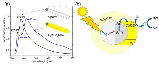 (a) The absorbance spectra of AgNWs and the core/shell Ag/SnO2NWs. (b) Schematic illustration of the photocatalytic mechanism of Ag/SnO2NWs under visible light irradiation.