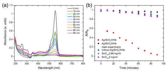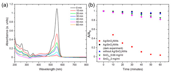 The intensity absorbance of rhodamine B was measured every 10 min after illumination by the selected light source. The samples were centrifuged for photocatalyst separation and further study of the optical properties of the supernatant with the dye. Figure 3a shows absorbance spectra of the supernatant with rhodamine B at the selected time points after 395 nm LED light irradiation. The absorbance intensity significantly decreased after 10 min of illumination and the dye was completely degraded in less than 1 h. It indicates the high efficiency of Ag/SnO2NWs as a photocatalyst under the irradiation from the visible light region. To study the process in detail and the influence of different factors on the photodegradation process, rhodamine B degradation was studied under various conditions (Figure 3b). It is essential to study all the conditions and system components to avoid the possibility of spectral interferences by transformation intermediates which may absorb radiation at the wavelength of the dye’s absorption maximum [18]. The ability of the degraded substance to inject electrons into the conduction band of a semiconductor should be primarily tested. Rhodamine B with the Ag/SnO2NWs photocatalyst presence but not light-irradiated (dark experiment) did not show any degradation process (Figure S4). The dye sample without the Ag/SnO2NWs but illuminated by 395 nm LED lamp revealed a slight decrease in the absorbance intensity (Figure S5) and proved that the photodegradation effect appears only in the presence of Ag/SnO2NWs. Moreover, the contribution of SnO2 in the photodegradation process in this range of illumination was verified. For these purposes, SnO2 was synthesized using stannate precursor as in the case of the shell but without AgNWs presence. The process resulted in SnO2 nanoparticles (SnO2NPs) formation, described in our previous report [16]. To compare the influence of SnO2 on the photocatalytic activity the Ag/SnO2NWs, SnO2NPs were added to the dye solution at the concentration of the whole core/shell complex (2 mg/mL) and at the concentration of the tin oxide in the shell (0.66 mg/mL) (Figure 3b). The weight percentage of the SnO2 shell in Ag/SnO2NWs complex was determined on the EDS studies and was about 33 wt.% (Figure S6). SnO2 is known as an efficient photocatalyst under UV irradiation [19,20,21]. In our system, after irradiation by light from the visible region, both concentrations of SnO2NPs showed a slight degradation rate of rhodamine B as a result of the negligible influence of this radiation on tin oxide nanostructures (Figure 3b and Figure S7).