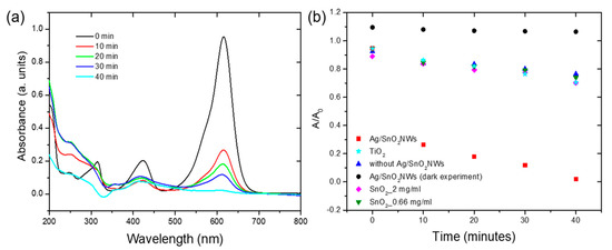 Ag/SnO2NWs were also applied for the degradation of malachite green, which is present in the environment and its remediation is highly required. Malachite green is a dye that is commonly used in the textile and food industry. It should be removed after industrial processes due to the fact that it is highly toxic, especially for aquatic flora and fauna [30,31,32]. Figure 5a shows the rapid degradation of malachite green by Ag/SnO2NWs under the light from the visible range (450 nm); malachite green was completely decomposed after 40 min. The absorbance intensity of the dye with Ag/SnO2NWs photocatalyst presence but without any irradiation did not change significantly (Figure 5b and Figure S11). The dark experiment proved the photodegradation mechanism for fast malachite green decomposition. Malachite green irradiation at the wavelength of 450 nm without photocatalyst revealed only a slight decrease in the absorbance intensity (Figure 5b and Figure S12). The irradiation of SnO2NPs at both concentrations, 2 mg/mL as Ag/SnO2NWs and 0.66 mg/mL corresponding to SnO2 amount in the core/shell complex also showed only a slight degradation rate of malachite green (Figure 5b and Figure S13). Moreover, to compare Ag/SnO2NWs photocatalyst efficiency at the visible range to a well-known commercial photocatalyst, malachite green was treated with TiO2 under 450 nm irradiation. TiO2 as a semiconductor that is characterized by absorption in the UV range, decomposed the dye only to a minimal extent (Figure 5b, Figures S14 and S15) [33]. The core/shell Ag/SnO2NWs system shows a high degradation rate of organic pollutants under visible light irradiation and can be used in practical photocatalysis reactions for efficient remediation.