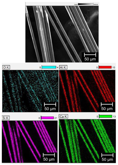 In the SEM images of pure silica fabric (Figure 5), one can see the fibers bound with a binder that provides a matrix for the applied photocatalysts. The surfaces of the fibers are virtually clear and smooth. EDX mapping shows that only Si, O, Al, and Ca originate from the fibers and the inorganic binder.