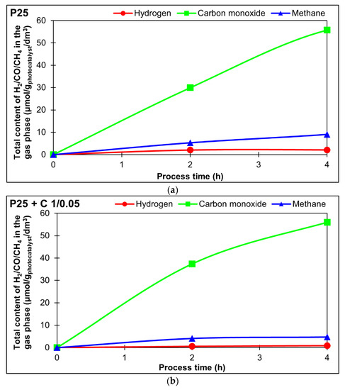 The addition of carbon spheres in an amount of 0.05 g per 1 g of TiO2 resulted in a slight increase in the photocatalyst activity (Figure 9b) compared to pure P25 (Figure 9a). The comparison of the photoactivity towards CO production is presented in Figure 10. The amount of carbon monoxide produced decreased slightly from 55.75 µmol/gphotocatalyst/dm3 for P25 and 55.94 µmol/gphotocatalyst/dm3 for P25 + C 1/0.05 to 43.62 µmol/gphotocatalyst/dm3 for the sample P25 + C 1/0.1 and to 46.79 µmol/gphotocatalyst/dm3 in the case of the P25 + C 1/0.5 material. At the same time, the amount of methane decreased significantly and gradually from 9.02 µmol/gphotocatalyst/dm3 (pure P25) through 4.76 and 4.02 µmol/gphotocatalyst/dm3 for materials P25 + C 1/0.05 and P25 + C 1/0.1, respectively; to practically 0.00 µmol/gphotocatalyst/dm3 in the case of the P25 + C 1/0.5 sample.