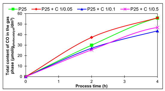 Total content of carbon monoxide of the photoreduction of CO2 for the studied samples: P25; P25 + C 1/0.05; P25 + C 1/0.1, and P25 + C 1/0.5.