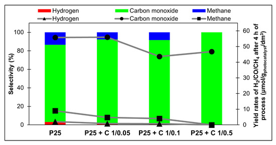 The reactivity of the photocatalysts is probably limited by the reduction of water to hydrogen, which is the first stage of the whole complex process. In our case, with the exception of sample P25 + C 1/0.5, there is some excess of hydrogen, which is a positive phenomenon.