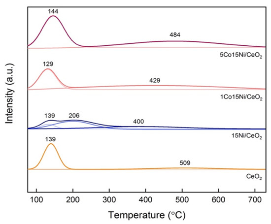 CO2-TPD profiles of the studied samples are shown in Figure 2. The profile of the reference sample (15Ni/CeO2) presents three main peaks at 138 °C, 206 °C and 400 °C, which can be ascribed to weak, medium, and strong basic sites, respectively. However, in the presence of Co only two peaks can be observed. The total basicity and the weak, medium, and strong basicity repartition are reported in Table 2.