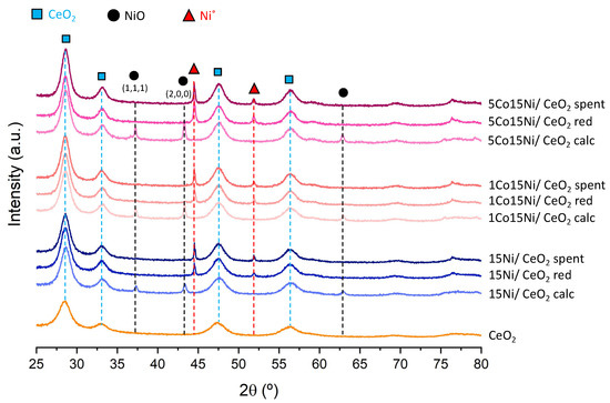 In addition, XRD diffractograms of calcined and reduced catalysts are presented in Figure 3. The presence of CeO2 diffraction lines (28.6, 33.1, 47.5, 56.4, 59.1, 68.1, 76.8 and 79.1°; JCPDS card 81-0792 [19,42]) is confirmed in all of the catalysts after calcination and reduction, indicating that Ce species nature was not affected by the reduction process. Regarding Ni species, NiO diffraction lines were clearly identified in calcined Ni and Co-Ni catalysts at 37, 43.2 and 62.9° (JCPDS card 78-0643) [19], while Ni0 phases were present after reduction (44.7 and 51.8°) [19]. We note that no Co3O4 diffraction lines (JCPDS card 78-1970) were identified in Co-containing catalysts. This could be due to the low metal loading used (1–5 wt%) or the presence of highly dispersed Co oxy-species on the catalysts. Based on CeO2 diffraction lines, an average crystallite size of 5 nm was determined (Table 4). Regarding NiO crystallite sizes, results are shown in Table 5 and suggest that Co incorporation leads to the formation of larger NiO crystallites after calcination (increase of 5 nm when comparing to 15Ni/CeO2). Furthermore, for reduced catalysts, the incorporation of 5 wt% Co led to the formation of smaller Ni0 crystallites (32 nm, lower than the 38–39 nm obtained for 15Ni/CeO2 and 1Co15Ni/CeO2 reduced catalysts; Table 4), indicating that Co could have an efficient effect in the prevention of agglomeration processes in Ni0 particles. Furthermore, when compared to other studies, it is worth mentioning that Benrabbah et al. [43] reported values of ~28 nm after reduction for 15Ni/CeZrO2. The higher values obtained in this work could be due to the preparation method, as these authors used a heating rate for calcination of 5 °C/min while in this study this step was carried out by 10 °C/min.