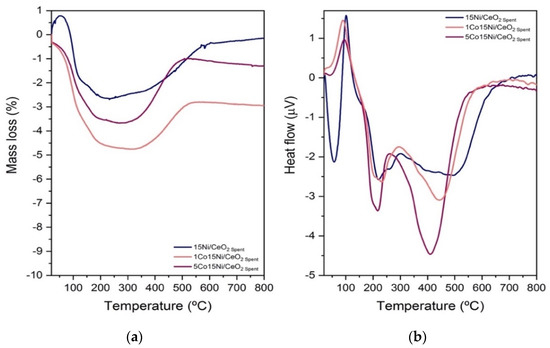Spent samples were also analyzed by TGA (Figure 7). As observed, a mass variation process was observed below 400 °C in the catalysts, corresponding to the loss of adsorbed water in the samples. On the other hand, at higher temperatures (>600 °C), where coke should be decomposed, the mass loss is negligible, indicating that no carbonaceous species were deposited in the catalysts during the tests [47].