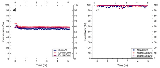 Moreover, for the 1Co15Ni/CeO2 catalyst, when comparing to HT1Co20Ni [17], higher conversion with much higher GHSV can be observed. It is worth mentioning that when comparing the basicity of these two catalysts, the number of basic sites (especially medium ones) for the 1 wt% Co catalyst of this study is higher, which is in a good agreement with the reported effect of the catalyst’s basicity on the performances [41].