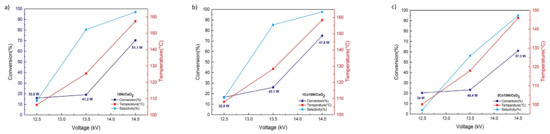 Furthermore, for all the range of studied voltage from 25 to 29 kV peak to peak which corresponds to 12.5 kV to 14.5 kV peak voltage in Figure 9, the 1Co15Ni/CeO2 catalyst exhibited higher conversion (Figure 9b). This conversion is of course increase with the voltage. Finally, the higher conversion was found to be 75% at 29 kV. The conversion is also linked with the temperature measured for the different operating conditions. Indeed, the higher temperature was observed for the higher obtained conversion. It was also already reported on promoted Ni/CeZrOx catalysts [39] that depending on the type of the promoter, a modification in the basicity distribution could be observed. Thus, the investigation of basic properties showed that the addition of the promoters (Gd, Y and Co) not only led to an increase in the total number of basic sites of the catalyst, but also the number of moderate basic sites which are reported to be the predominant ones for methanation reaction. In our study, among the Co promoted materials the 1Co15Ni/CeO2 catalyst exhibited both the higher number of basic sites but also the higher number of medium basic ones. Thus, in agreement with thermal methanation, the basic sites presented on our materials play an important role both in thermal and plasma assisted methanation reaction on Ni-Co/CeO2 catalysts. On the other hand, the synergistic effects are also an important factor regarding different behavior of catalyst. Furthermore, the plasma can lower the activation barrier which leads to a faster reaction occurrence. Finally, the plasma can also change the surface reaction pathway with the presence of excited species which results in a change in the transition state, as proposed elsewhere [24].