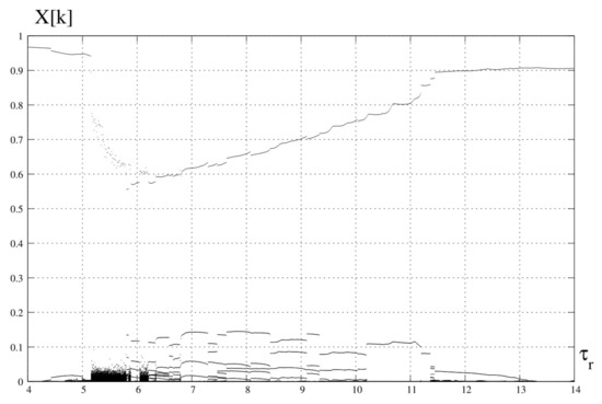 - Merta, H. Characteristic time series and operation region of the system of two tank reactors (CSTR) with variable division of recirculation stream. Chaos Solitons Fractals 2006, 27, 279–285. [Google Scholar] [CrossRef]