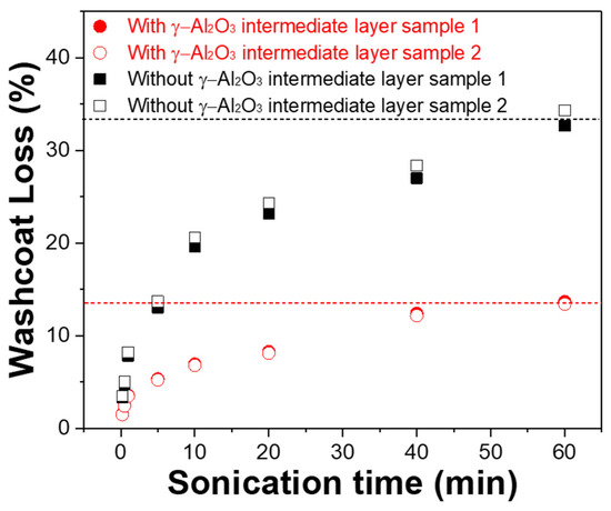 Washcoat loss of Pt/γ-Al2O3 catalyst with and without the γ-Al2O3 intermediate layer on STS-444 substrate.
