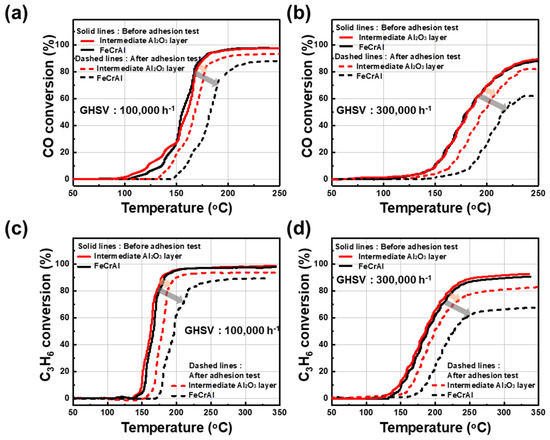 CO (a,b) and C3H6 (c,d) oxidation performance of the catalysts with and without the γ-Al2O3 intermediate layer on the STS-444 substrate under two GHSV (100,000 and 300,000 h−1) conditions.