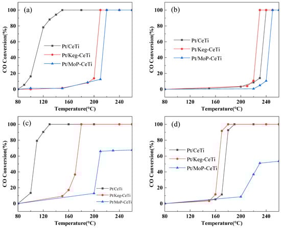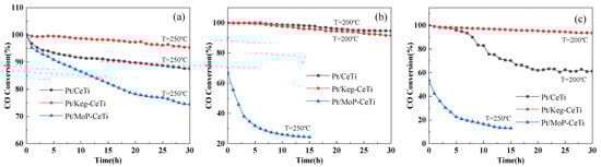 The catalytic performances of the Pt/CeTi, Pt/Keg-CeTi, and Pt/MoP-CeTi catalysts in the absence and presence of H2O or SO2, or both, are displayed in Figure 1. It was found that Pt/CeTi showed a much higher CO oxidation activity in the absence of H2O and SO2, and the CO conversion was up to 100% at 150 °C, which is consistent with the literature result []. Meanwhile, the intrinsic activities of Pt/Keg-CeTi and Pt/MoP-CeTi were much lower compared to Pt/CeTi (Figure 1a), and their CO complete conversion temperatures were 210 °C and 220 °C, respectively. It is known that the presence of ceria in the support can improve the catalytic performance of noble metal catalysts for CO oxidation by storing oxygen during oxidation and releasing it during reduction []. The introduction of molybdophosphate led to the partial covering of the CeTi surface, which restrained the synergism between Pt and cerium species. When a small amount of SO2 was introduced into the feed mixture, obvious decreases in the activities of the three samples were observed, particularly for Pt/CeTi, due to the significantly detrimental effect of SO2. In the presence of SO2 and O2, Ce(IV) ions could transform into Ce(III) ions according to the following reaction [,]: 2CeO2 + 3SO2 + O2 → Ce2(SO4)3, which caused the redox cycle between Ce (IV) and Ce (III) to be terminated. The Pt/Keg-CeTi showed the highest activity in the presence of SO2 compared to the two others (Figure 1b). On the other hand, the introduction of H2O had, to a certain extent, a positive effect on the activities of the Pt/CeTi and Pt/Keg-CeTi catalysts (Figure 1c), and their CO complete conversion temperatures decreased to 130 °C and 180 °C, respectively. However, the activity of Pt/MoP-CeTi declined significantly, and the CO could not convert completely even under high temperature. This might be explained by the adsorption of H2O molecules on the active centers, inhibiting the catalytic process due to the structure change of the support used. In the presence of both H2O and SO2, the activity of Pt/Keg-CeTi was also slightly higher than that of Pt/CeTi and was much better than that of Pt/MoP-CeTi (Figure 1d), revealing the better sulfur and water resistance.