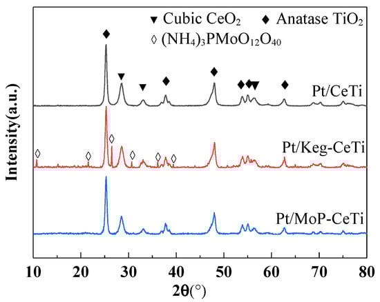 X-ray diffraction patterns of the Pt/CeTi, Pt/Keg-CeTi, and Pt/MoP-CeTi catalysts.