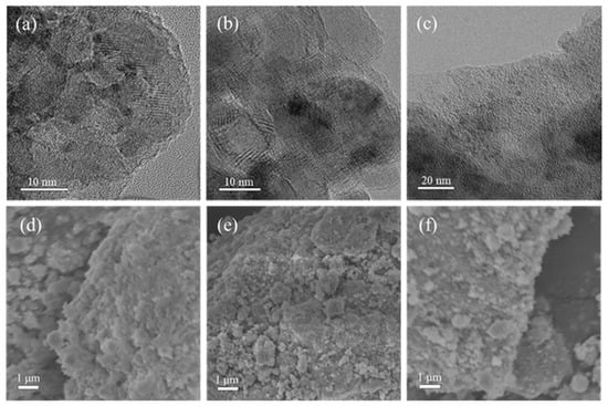 TEM and SEM images of the Pt/CeTi (a,d), Pt/Keg-CeTi (b,e), and Pt/MoP-CeTi (c,f) catalysts.