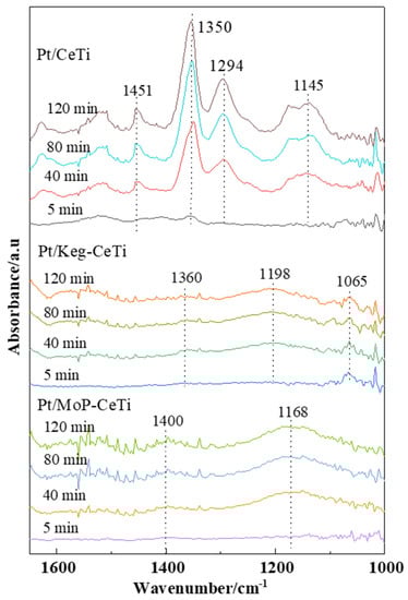 In order to understand the difference in sulfur resistance of the Pt/CeTi, Pt/Keg-CeTi, and Pt/MoP-CeTi catalysts, the adsorption of SO2 on the three catalysts under the same conditions was investigated in detail by in situ IR spectroscopy and temperature-programmed desorption experiments. The DRIFTS results of SO2 adsorption experiments in the presence of 150 ppm of SO2 and a large excess of O2 at 250 °C are shown in Figure 5. For the Pt/CeTi sample, after the introduction of SO2, four adsorption bands at 1451, 1350, 1294, and 1145 cm−1 were observed and their intensities increased with time. According to other studies [,,,,], the peaks at 1451, 1350, and 1294 cm−1 were attributed to the surface sulfate species. The band centered at 1145 cm−1 was assigned to the bulk-like sulfate, revealing that the surface and bulk sulfate species were formed nearly simultaneously on the Pt/CeTi surface. For the Pt/Keg-CeTi sample, a peak at 1065 cm−1 was detected in the first 5 min, which was attributed to symmetrical oscillations of sulfites [], which could be detected in the whole experimental time. The signals attributed to the surface and bulk sulfates were much weaker, implying that the accumulation of sulfate species on the catalyst was inhibited significantly due to the modification of the Keggin structure. For the Pt/MoP-CeTi sample, two wide and weak peaks at 1400 and 1168 cm−1 were detected, which were assigned to surface sulfate and bulk sulfate species [], respectively. It can be seen that both surface sulfate and bulk sulfate species were detected on the three catalysts, but the corresponding peak intensities were quite different. Obviously, the amount of sulfate species on Pt/Keg-CeTi was much lower than those of Pt/CeTi and Pt/MoP-CeTi.