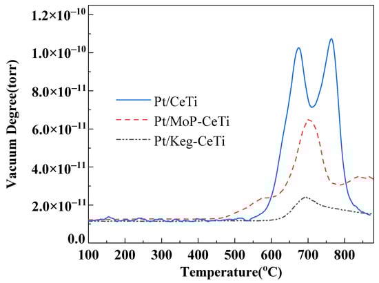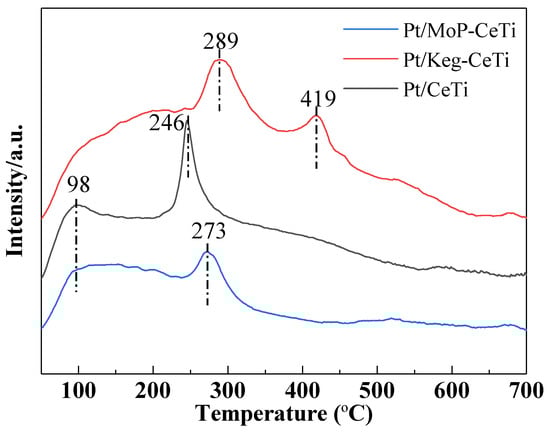 The surface acidity of the catalysts was characterized using the NH3-TPD technique. From the TPD profile (Figure 8), two broad NH3 desorption peaks centered at 98 and 273 °C, 98 and 246 °C, and 289 and 419 °C could be observed, respectively, for the Pt/MoP-CeTi, Pt/CeTi, and Pt/Keg-CeTi samples between 50 °C and 600 °C. The signal in the low-temperature range (50–200 °C) was assigned to the desorption of physiosorbed NH3 on the weak acid sites, and the signal in the high-temperature range (200–600 °C) was ascribed to the desorption of chemisorbed NH3 on the strong acid sites []. It was known that the high surface acidity could inhibit the adsorption of SO2 on the catalyst surface []. It could be seen that there were many more acid sites, particularly for strong acid sites on the surface of Pt/Keg-CeTi. The calculated data showed that the number of total acid sites was in the order of Pt/Keg-CeTi > Pt/CeTi > Pt/MoP-CeTi (Table S3), which was consistent with their sulfur resistance, implying that the surface acidity of the catalyst might be one factor influencing its sulfur resistance in CO oxidation.