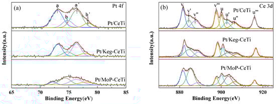 XPS spectra of Pt 4f (a) and Ce 3d (b) in the Pt/CeTi, Pt/Keg-CeTi, and Pt/MoP-CeTi catalysts.