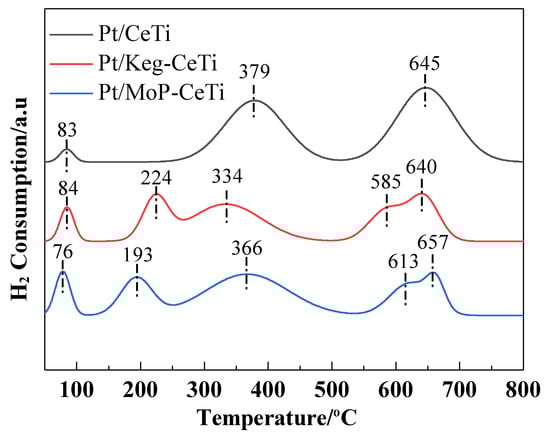 H2-TPR profiles of the Pt/CeTi, Pt/Keg-CeTi, and Pt/MoP-CeTi catalysts.