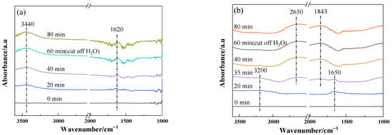 Changes in H2O-DRIFTS spectra of Pt/Keg-CeTi (a) and Pt/MoP-CeTi (b) with time. Conditions: [H2O] = 3 vol%, balance N2, total flow rate = 50 mL/min, at 250 °C.
