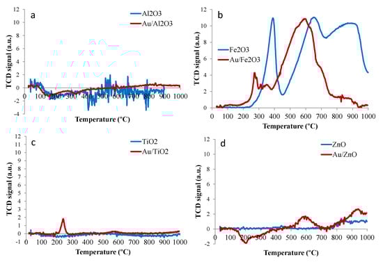 TPR profiles of supports and Au samples: (a) Al2O3, (b) Fe2O3, (c) TiO2, (d) ZnO. Adapted from [5] with permission from Wiley.