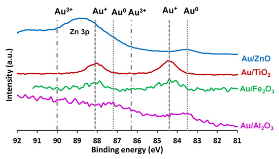 Figure 2 shows the superimposed temperature-programmed reduction (TPR) profiles of the supports and the gold containing samples and temperature of the main peaks are summarized in Table 1. The Al2O3 profile (Figure 2a) did not show any significant reduction peaks, as expected for an irreducible oxide [5,41], while Fe2O3 (Figure 2b) showed several reduction peaks, such as the peak at 391 °C that can be attributed to the reduction of hematite to magnetite (Fe3O4) [5,42,43] the peak at 660 °C that represents the reduction of Fe3O4 to wustite (FeO) [5,44,45] and the peak >800 °C that is attributed to the reduction of FeO to Fe [46,47]. In the Au/Fe2O3 sample, as Au is in the Au+ state, a sharp peak was observed at 272 °C and can be assigned to the Au reduction (Au0) [45,48]. The TiO2 support does not show any significant reduction peaks (Figure 2c) [5,49], while the Au/TiO2 sample shows a sharp peak at ~240 °C due to the reduction of Au ions [50]. The ZnO support shows a small peak above 800 °C (Figure 2d) [5,51] while the presence of Au creates a peak at 600 °C and the previous peak at 800–900 °C increases in intensity. A negative peak at ~200 °C is also observed, which is probably due to the result of the dehydroxylation process of ZnO [5,52] when Zn(OH)2 was formed upon Au addition.